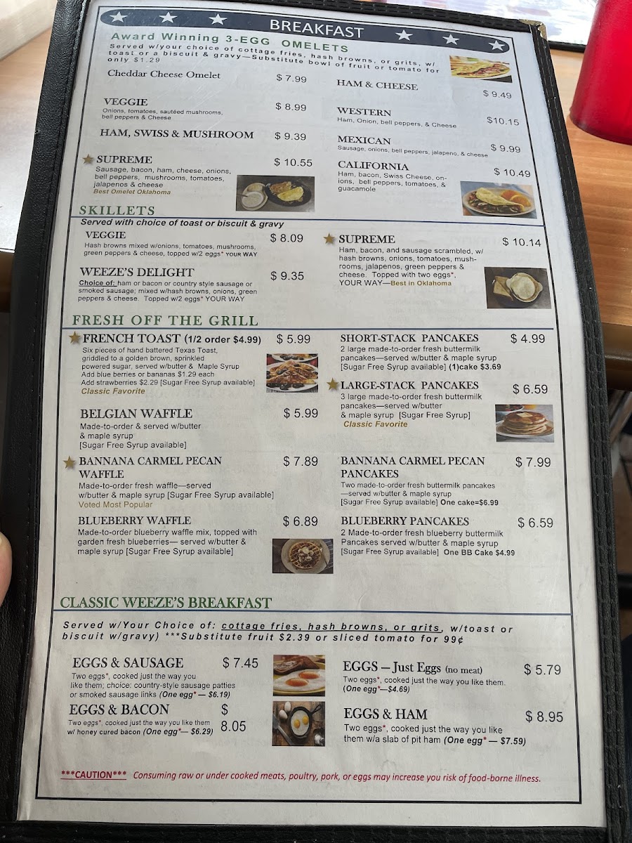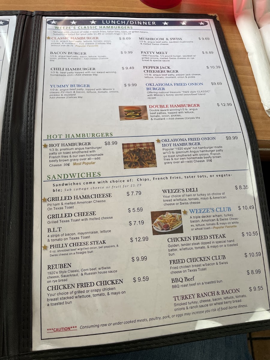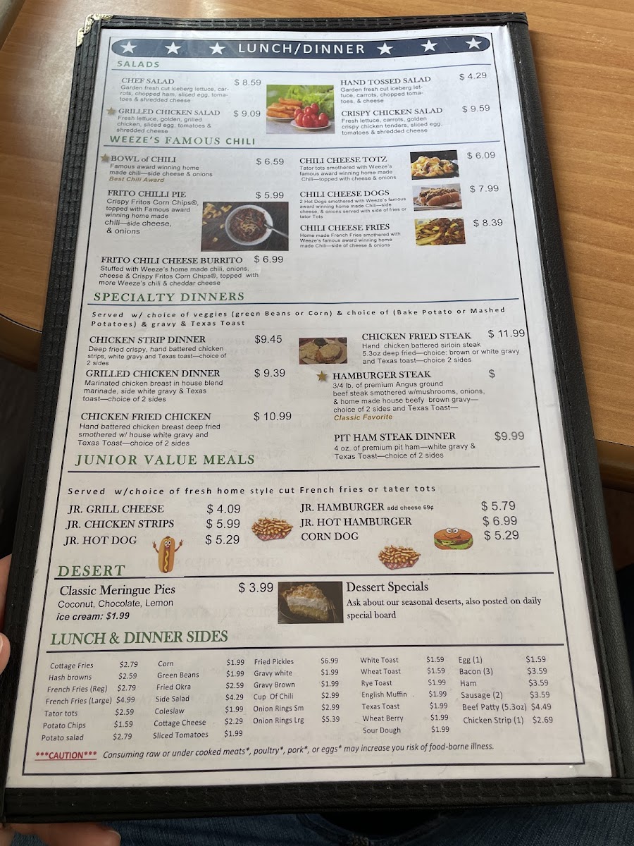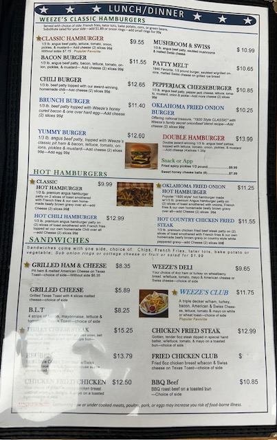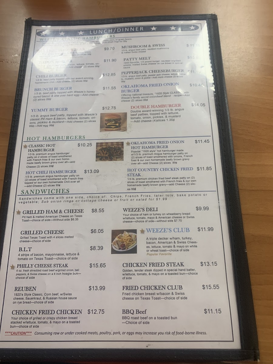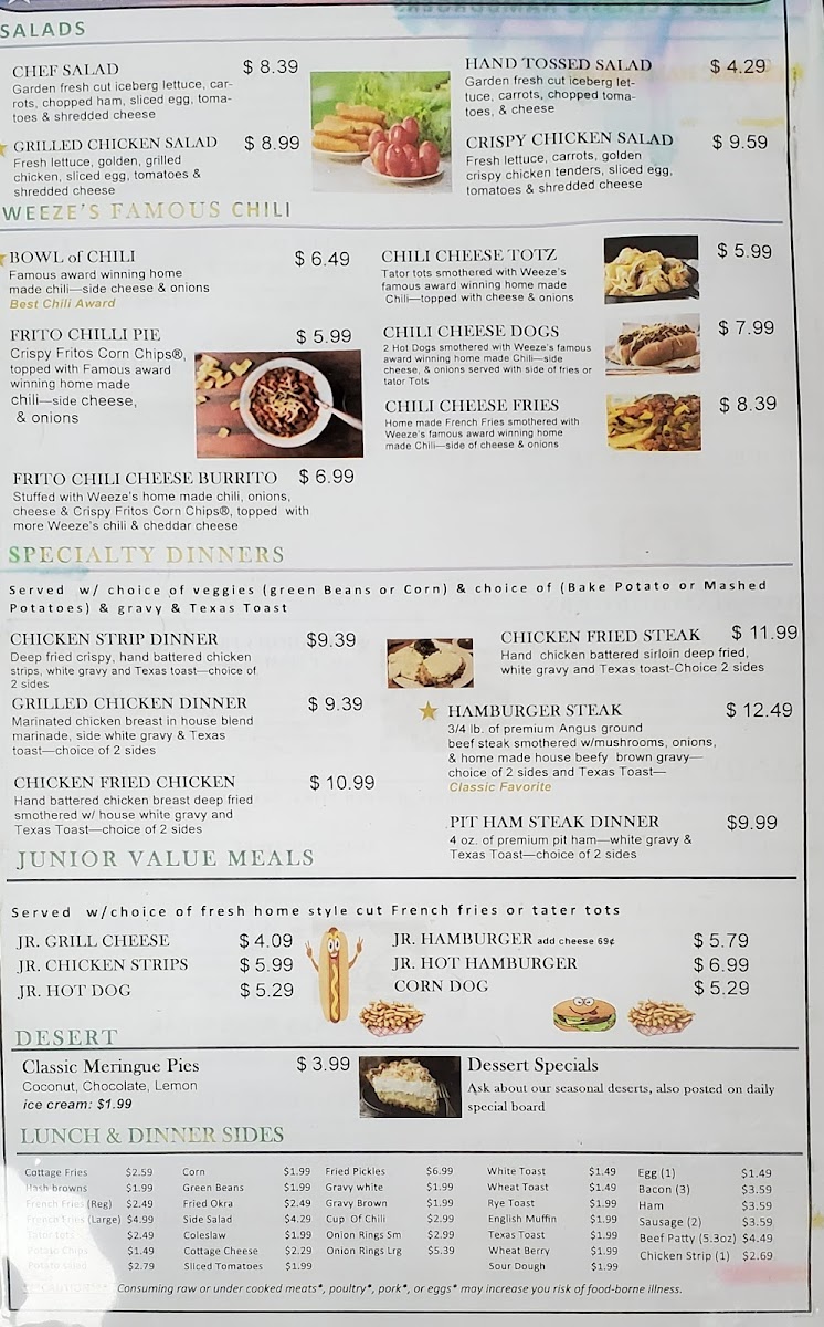 Welcome to Weeze's Cafe, a charming spot located in Bartlesville, Oklahoma. This family-owned cafe invites you to enjoy a menu brimming with comfort food that evokes nostalgic feelings of classic diners. From the Grilled Chicken Salad ($10.35) to the hearty bowls of Weeze's Famous Chili ($5.99), there's something to please every palate. The café excels in offering generous portions, perfect for satisfying cravings without breaking the bank. Customers rave about the attentive service and welcoming atmosphere, making every visit feel special.